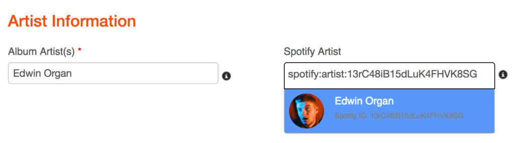 Important to note: Only use the ‘Spotify Artist‘ field if the artist already has an artist page set up on Spotify. If you’ve never released music on Spotify before, please leave this field blank, and a new artist page will be created for you automatically.